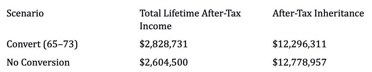 Conversion increased lifetime income by $224,231 but slightly reduced after-tax inheritance by $482,646.
